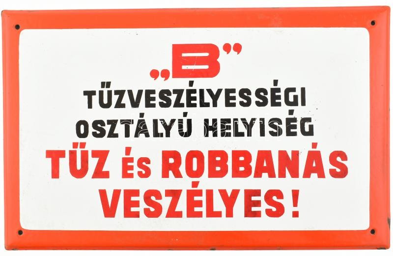 Description: "B" osztályú tűzveszélyességi osztályú helyiség, tűz és robbanás veszélyes!, zománcozott fém tábla, alsó peremén kissé sérült, hátoldala kopott, 24,5×39,5 cm