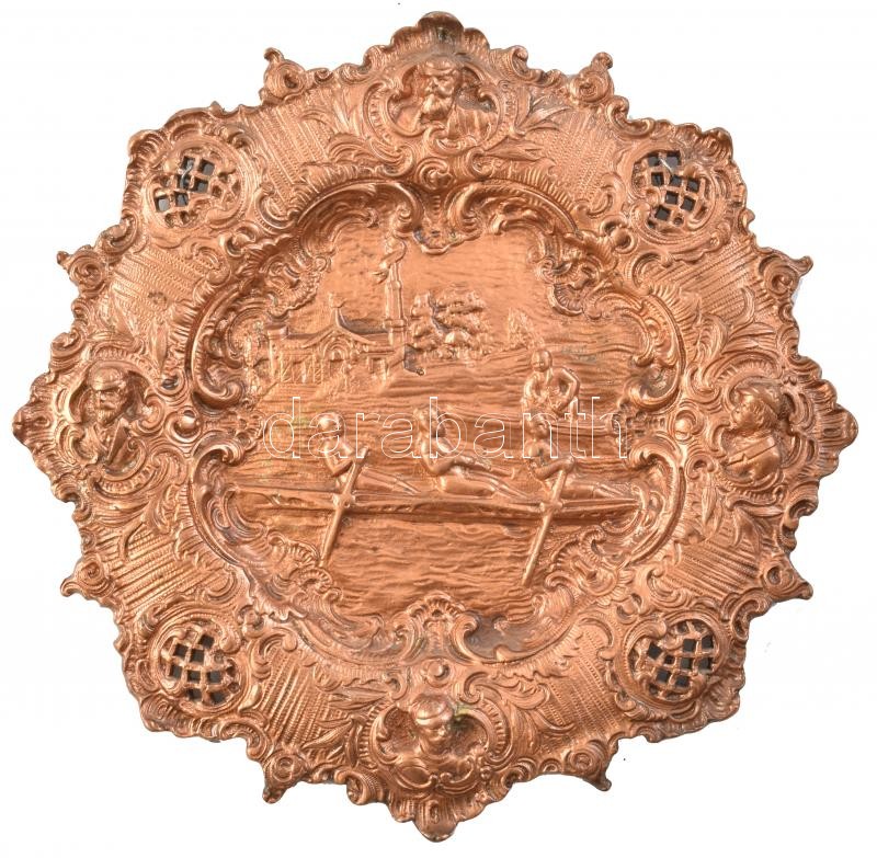 Evezősök, plasztikus, áttört rezezett fém falitányér, 21,5x22 cm