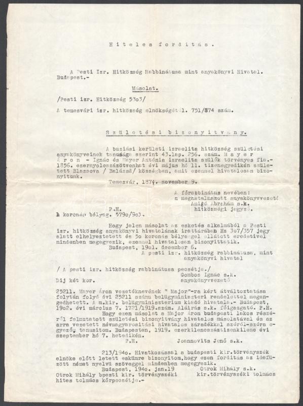 Description: 1901-1940 Buziási születésű személy anyakönyvi kivonatának másolata, a Pesti Izraelita Hitközség által kiállítva, hiteles fordításokkal, és házassági anyakönyvi kivonat másolatával.