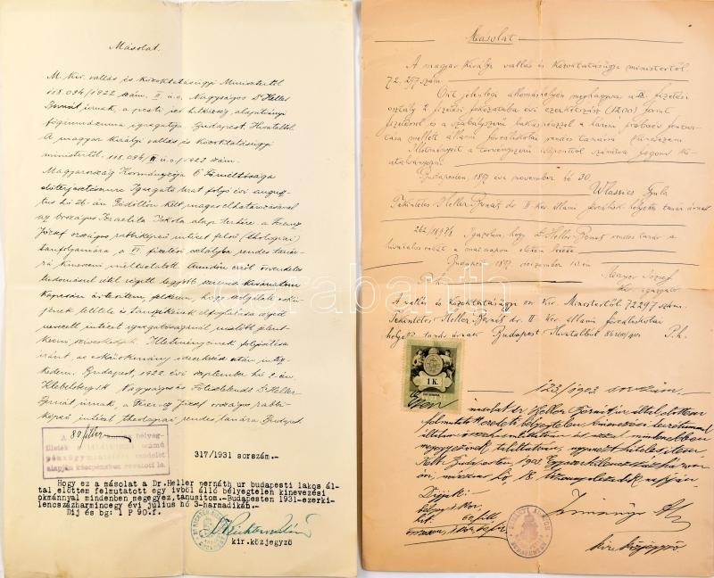 Description: 1903-1931 Heller Bernát (1871-1943) irodalomtörténész, orientalista, az Országos Rabbiképző Intézet tanárának két tanári kinevezésének korabeli hiteles másolata