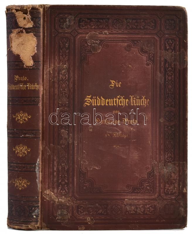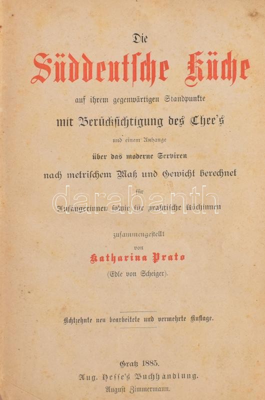 Prato, Katharina: Süddeutsche Küche auf ihrem gegenwörtigen Standpunkte. Graz, 1885, Aug. Hesse's Buchhandlung. Kiadói aranyozott egészvászon kötésben. Német nyelven. BorÃtó, gerinc sérült, foltos, egy lap hiányzik.
