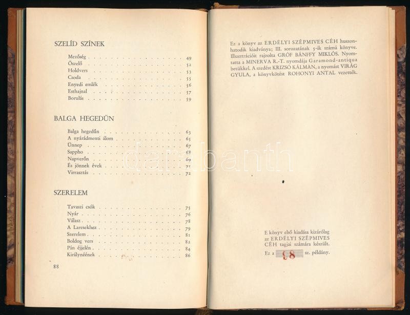 Berda Mária: Sherezáde himnusza. - - versei. Kolozsvár, 1928, Erdélyi Szépmíves Céh, (Minerva-ny.), 88+2+VI (Erdélyi Szémíves Céh tagjainak névsora)+4 p. + 4 (gróf Bánffy Miklós 4 egészoldalas illusztrációja) t. Első kiadás. 88. számú számozott példány. Kiadói félbőr-kötésben, kissé kopott borítóval.