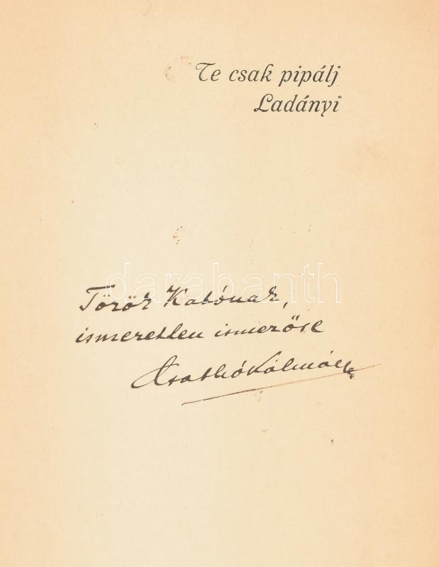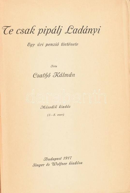 Csathó Kálmán: Te csak pipálj Ladányi. Egy úri penzió története. Bp.,1... https://www.darabanth.com/en/400-Online-auction/400.0/Books/Books-Other-rarities~1500018/Csatho-Kalman-Te-csak-pipalj-Ladanyi-Egy-uri-penzio-tortenete-Bp-1916-Singer-es-Wolfn~II2455561