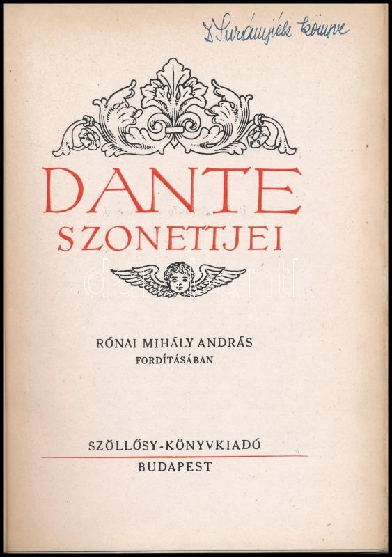 Dante Alighieri: Dante Szonettjei. Fordította Rónai Mihály András. Bp.... https://www.darabanth.com/en/400-Online-auction/400.0/Books/Books-Other-rarities~1500018/Dante-Alighieri-Dante-Szonettjei-Forditotta-Ronai-Mihaly-Andras-Bp-1943-Szollosy-110-p~II2455393