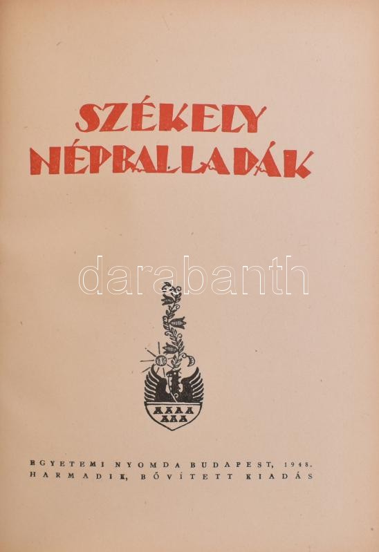 Székely népballadák. Összeállította és magyarázta: Ortutay Gyula. Buday György fametszeteivel. Bp., 1948, Egyetemi Nyomda. Harmadik, bővített kiadás. Kiadói aranyozott gerincű félbőr kötés, kopott borítóval.