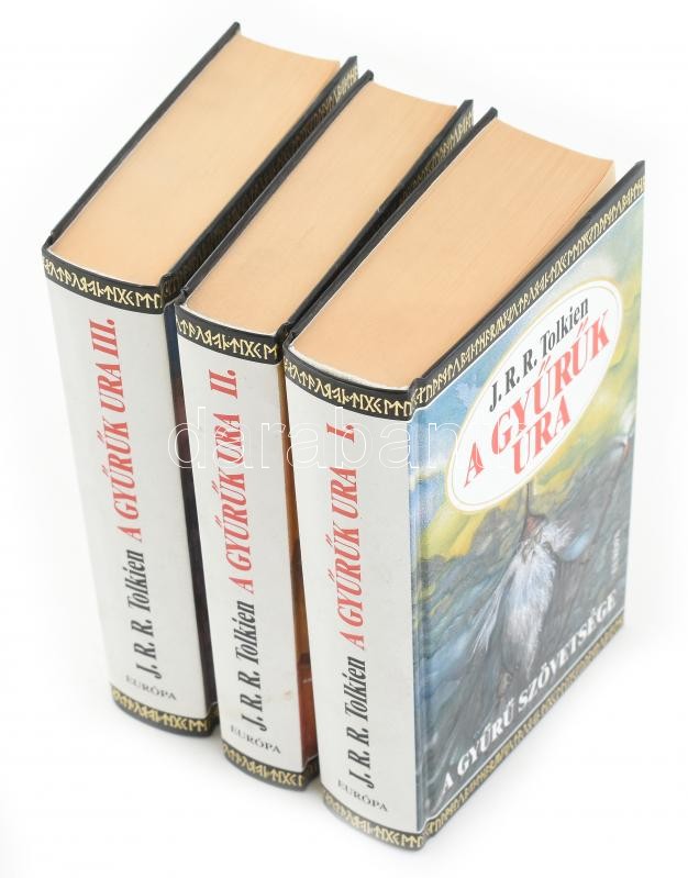 Tolkien, J. R. R.: A Gyűrűk Ura. I-III. kötet: A gyűrű szövetsége, A két torony, A király visszatér. Ford.: Göncz Árpád, Réz Ádám, Tandori Dezső. Bp., 2002, Európa. 540+438+533 p. Kiadói kartonált papírkötés, jó állapotban.