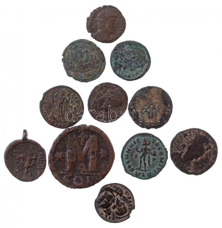 Description: 11db-os vegyes, főleg római kisbronz tétel, közte egy fülel + bizánci follis T:2-3