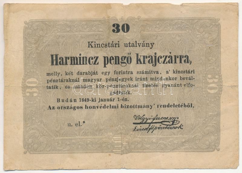 https://www.darabanth.com/en/400-Online-auction/400.0/Numismatics/Hungarian-Banknotes~2000007/1849-30kr-Kossuth-banko-csillagos-sorozatszammal-TIII-tulyuk-beszakadasok-Adamo-G103A~II2457338