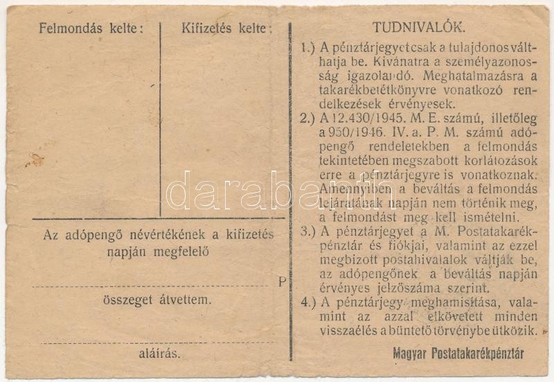1946. 100.000AP nem kamatozó Pénztárjegy "Másra Át Nem Ruházható&...