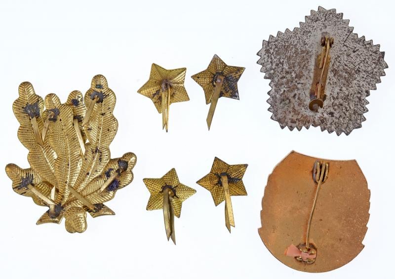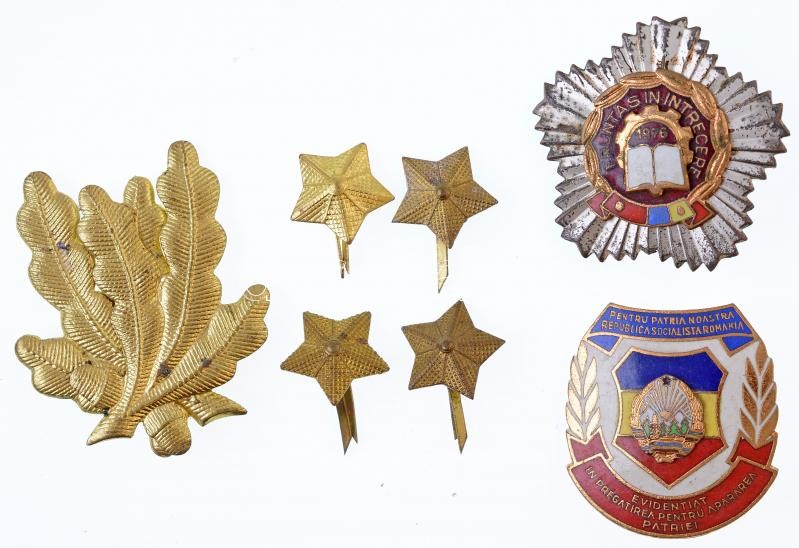 Romania ~1960-1980. 7pcs of mixed socialist badges, with 4pcs of shoulder stars + "Outstanding in preparing for home defense (EVIDENTIAT IN PREGATIREA PENTRU APARAREA PATRIEI)" gilt, enamelled badge C:XF,VF