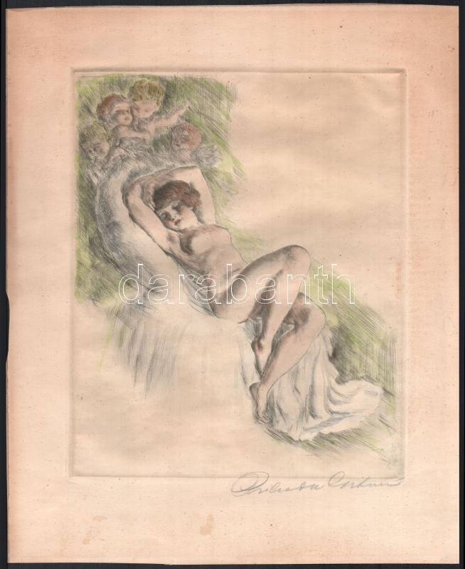 Description: cca 1925 Prihoda István (1891-1965): Fekvő akt című rézkarcának egyik tervezete, a véglegestől eltérően puttókkal. Színezett rézkarc, papír, jelzett, 27×22 cm