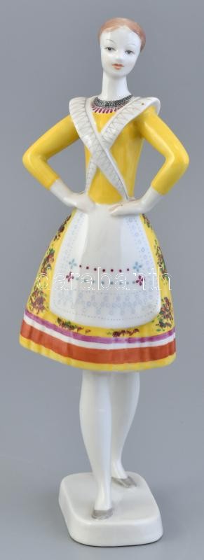 Hollóházi porcelán néptáncos lány, kézzel festett, jelzett, kis kopásnyomokkal, m: 24 cm