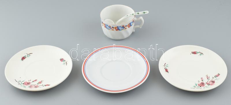 Vegyes porcelán tétel. Zsolnay tálka, csésze, 2 db gránit tálka, 19. századi kézzel festett kis porcelán kanál. Kopott, apró csorbák. Részben jelzett.