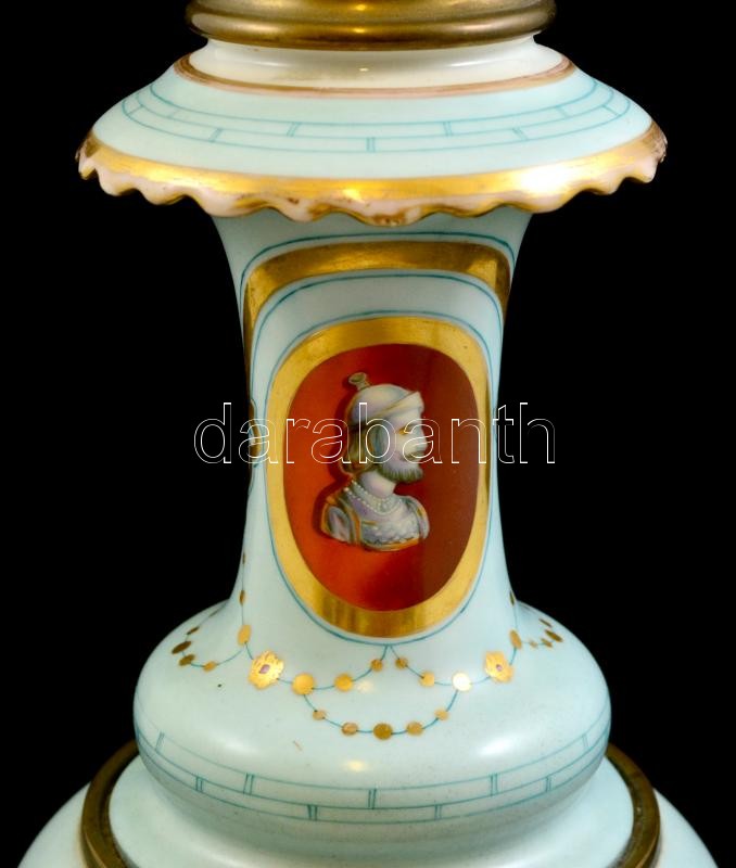 Description: cca 1890 Zsolnay porcelán lámpa Moderateur olajégővel Dietmar réz égőfejjel, kézzel festett reneszánsz páros portrés, kopott festéssel, jelzett, pótolt burával, m: 52 cm (71 cm)