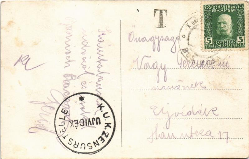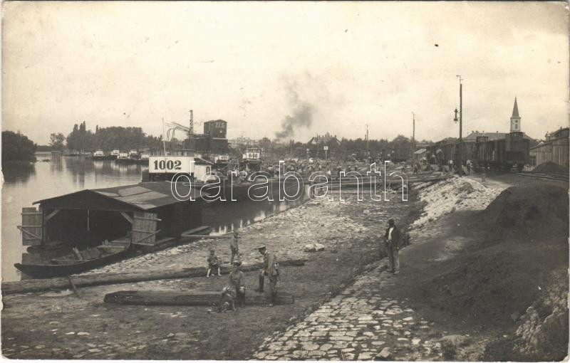 Description: Brod, Bosanski Brod; Első világháborús katonák rakodás közben a kikötőben, iparvasúti vagonok / WWI K.u.k. military, soldiers unloading ships at the port, industrial railway wagons. photo + "K.U.K. ZENSURSTELLE ÚJVIDÉK"