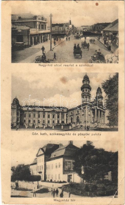 1915 Ungvár, Uzshorod, Uzhhorod, Uzhorod; Nagy híd utcai részlet a színházzal, Görögkatolikus székesegyház és püspöki palota, Megyeház tér / street view, bridge, theatre, cathedral, bishop's palace, county hall (vágott / cut)