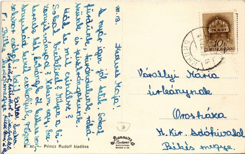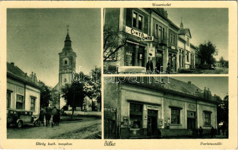 Description: 1941 Bilke, Bilok, Bilky; Görög katolikus templom, utca, Turista szálló és étterem, Cikta és Princz Rudolf üzlete / church, street, hotel and restaurant, shops + kétnyelvű pecsét / bilingual cancellation