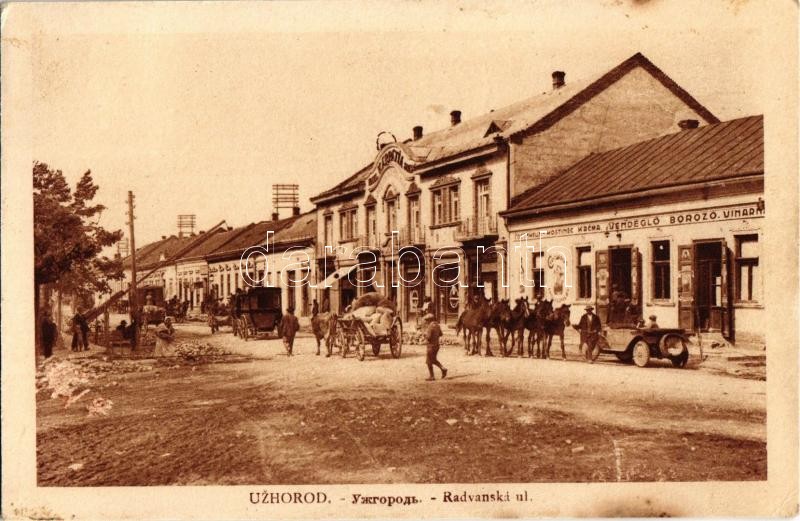 Ungvár, Uzshorod, Uzhorod; Radvanská ulica / Kárpátia szálloda, Kocsma, vendéglő és borozó, automobil, üzletek, sorompó / hotel, inn, restaurant, automobile, shops, barrier (EK)