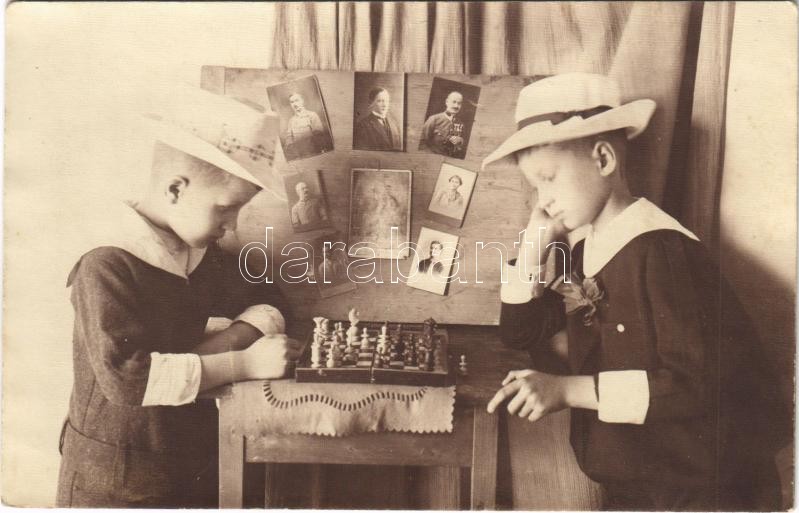 1919 Pécska, Magyarpécska, Pecica; Sakkozó gyerekek / children playing chess. photo (fl)