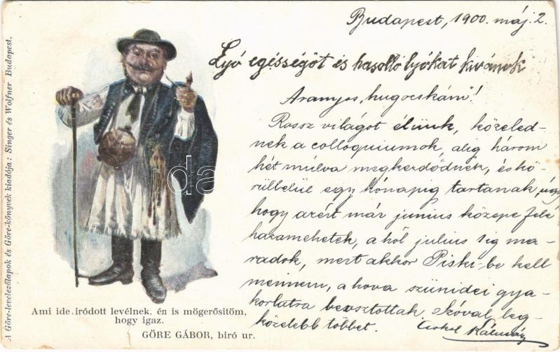 1900 Göre Gábor bíró úr. Göre levelezőlapok és Göre könyvek kiadója Singer és Wolfner / Hungarian humorous folklore greeting card (vágott / cut)