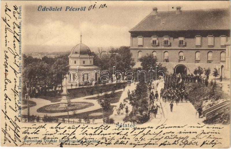 1900 Pécs, Sétatér, katonai felvonulás. Rechnitzer Ottokár fénynyomda ...