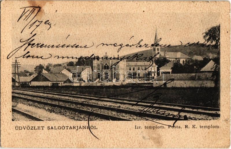Description: 1905 Salgótarján, Izraelita templom, zsinagóga, Posta, Római katolikus templom, vasúti sínek, vasútvonal. Kiadja Boros R. / synagogue (kis szakadás / small tear)