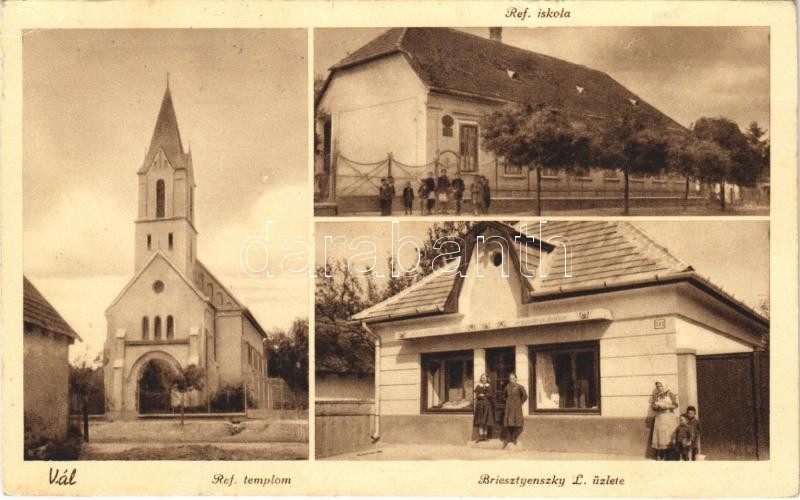 1949 Vál, Református templom és iskola, Briesztyenszky L. üzlete (EK)
