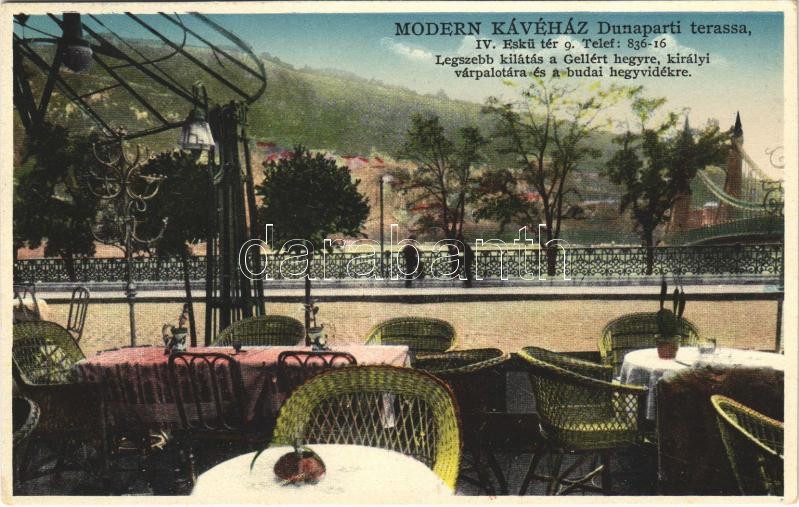 Budapest V. Hahn Ferenc Modern Kávéház terasza, Erzsébet híd. Eskü tér 9. (mai Március 15. tér)