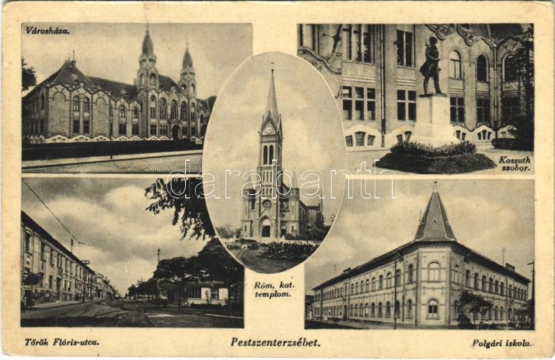 Description: Budapest XX. Pestszenterzsébet, Pesterzsébet, Erzsébetfalva; városháza, Kossuth szobor, polgári iskola, Római katolikus templom, Török Flóris utca (EK)