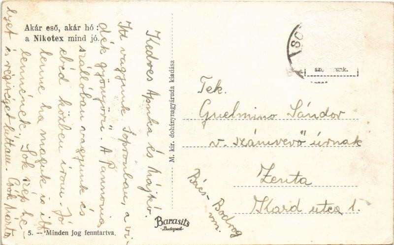 Sopron, Várkerület, Schwarcz József divatáruháza. Akár eső, akár hó: a Nikotex mind jó. reklám a hátoldalon (Rb)
