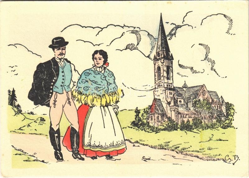 Description: Muraszombat, Murska Sobota; A régi katolikus templom, a vidék népviselete. Kiadja a Délvidéki Egyetemi és Főiskolai Hallgatók Egyesülete / Catholic church, traditional costumes, folklore; irredenta art postcard s: Cs. B. (EK)