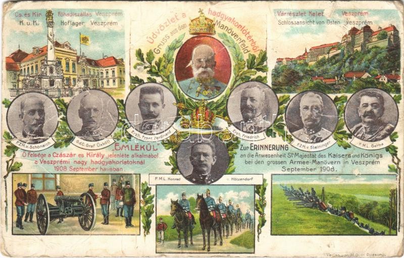 1908 Üdvözlet a veszprémi hadgyakorlótérből. Őfelsége a császár és király jelenléte alkalmából készült emléklap. Ferenc József, Schönaich, Graf Üxküll, Franz Ferdinand, Konrad Hötzendorf, Erz. Friedrich, Steininger, Gerba / Greeting card from the military practice area of Veszprém. Memorial card of Franz Jospeh's visit. Art Nouveau, litho (b)