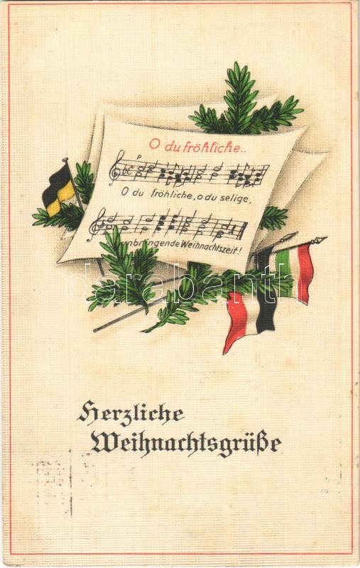 Description: 1916 Herzliche Weihnachtsgrüße / WWI German and Austro-Hungarian K.u.K. military art postcard, Viribus Unitis propaganda with Christmas greetings and flags. SB 5137. (fl)