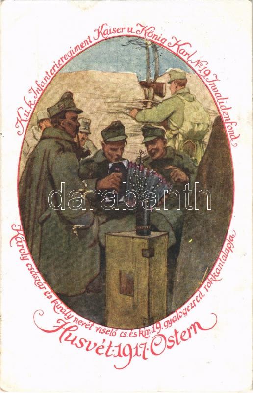 Description: 1917 K.u.K. Infanterieregiment Kaiser u. König Karl No. 19. Invalidenfond / Károly császár és király nevét viselő cs. és kir. 19. gyalogezred rokkantalapja / WWI Austro-Hungarian K.u.K. military art postcard with Easter greetings, support fund (EK)