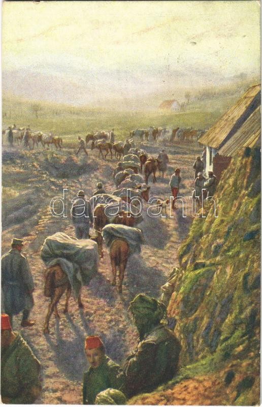 Description: 1917 Tragtier-Kolonne in Albanien / Teherhordó állatok csapata Albániában / WWI Austro-Hungarian K.u.K. military art postcard, supply convoy + "Kgl. ung. schw. Honvéd-Feld-Artillerie-Rgt. Nr. 42. Batterie Nr. 4."