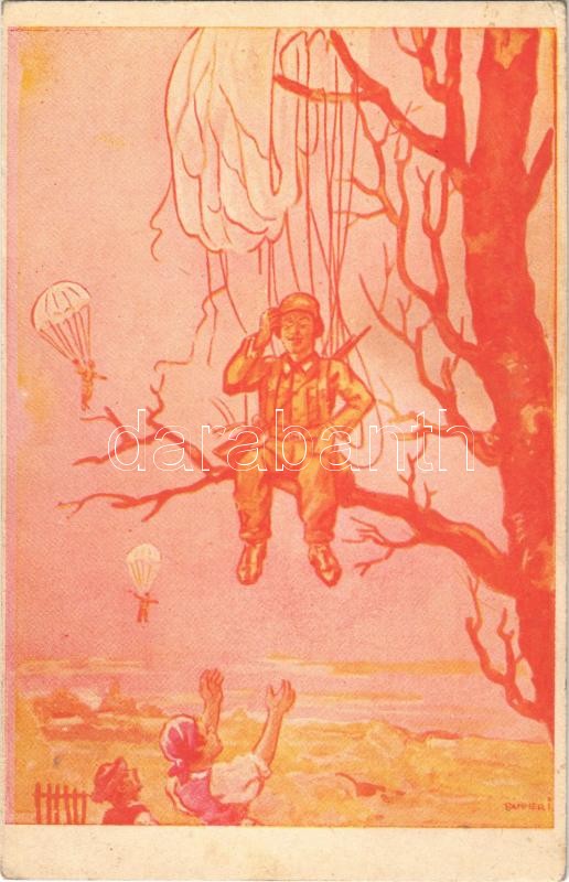 Ejtőernyős / WWII Hungarian military art postcard, paratrooper s: Pann...