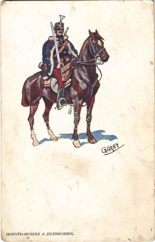 Description: Honvéd huszár a jelenkorból. A Magyar Huszár 8. Kiadja Kner Izidor könyvnyomdász / WWI Austro-Hungarian K.u.K. military art postcard, Hungarian hussar s: Garay (fl)