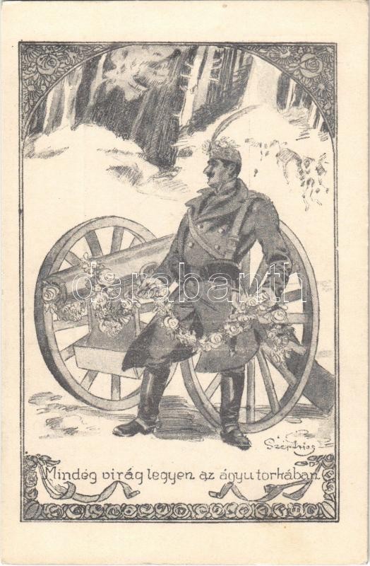 Description: Minden virág legyen az ágyú torkában! Darutollas lovas katonai propaganda művészlap. Heller K. és Tsa. / Hungarian military propaganda card, Art Nouveau s: Szép Lajos