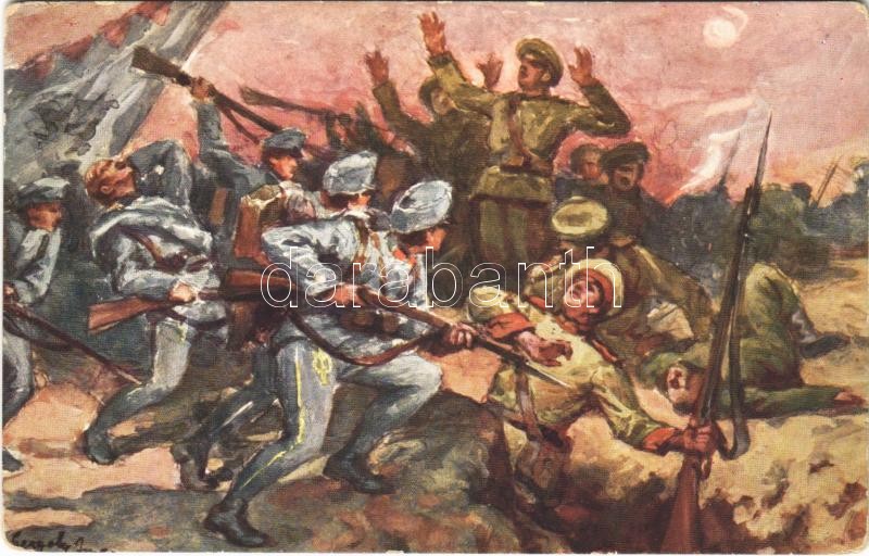 Szuronyroham / Bajonettangriff / WWI Austro-Hungarian K.u.K. military art postcard, bayonet attack s: Gergely Imre (EK)