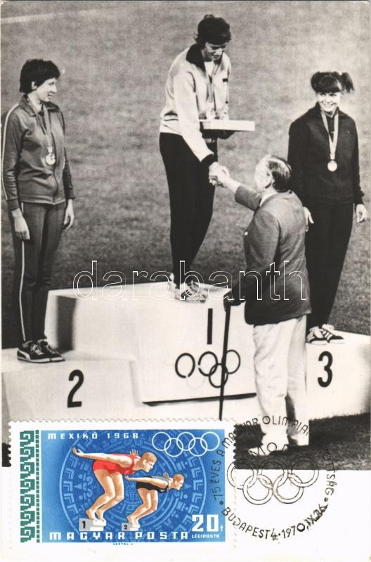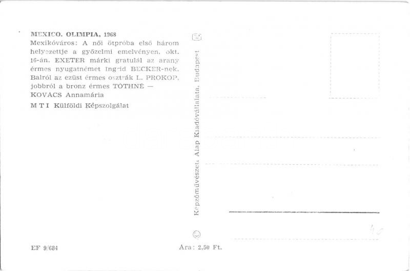 Mexico, Olimpia 1968. Mexikóváros: A női ötpróba első három helyezettje a győzelmi emelvényen, október 16-án. Exeter márki gratulál az arany érmes nyugatnémet Ingrid Beckernek. Balról az ezüst érmes osztrák L. Prokop, jobbról a bronz érmes Tóthné-Kovács Annamária. MTI Külföldi Képszolgálat. Képzőművészeti Alap Kiadóvállalat / XIX Olympiad / 1968 Summer Olympics in Mexico City. Women's Penthatlon medalists