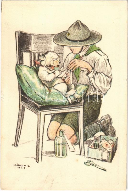 A cserkész ahol tud segít... Kiadja a Magyar Cserkészszövetség Nagytábortanácsa 1926. / Hungarian boy scout art postcard s: Márton L. (Rb)