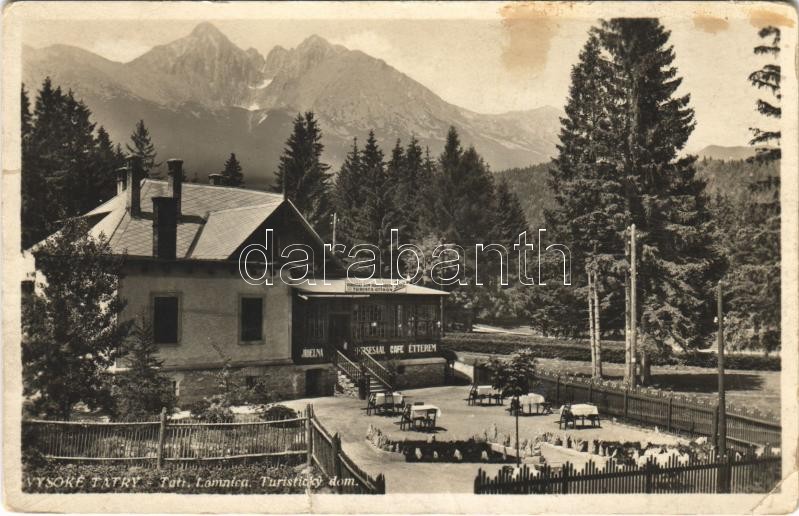 Description: 1938 Tátralomnic, Tatranská Lomnica (Tátra, Magas Tátra, Vysoké Tatry); Turisticky dom / Turistaotthon, étterem és kávéház / tourist house, restaurant and café (szakadás / tear)