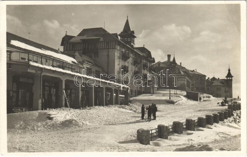 Tátra, Magas Tátra, Vysoké Tatry; Strbské pleso / Csorba-tó, étterem, üzletek, síelők, téli sport / lake, restaurant, shops, ski, winter sport (EB)
