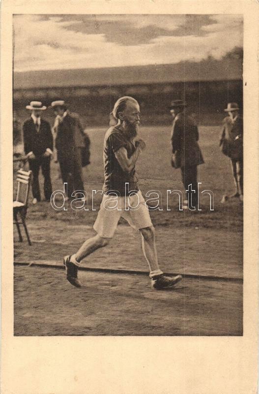 Description: 1913 B.E.A.C verseny, Id. Ripszám Henrik a legöregebb magyar atléta győz a gyalogsági handicapban, kiadja 'Klasszikus pillanatok vállalata' / BEAC competition 1913, the oldest Hungarian athlete Henrik Ripszám (EK)