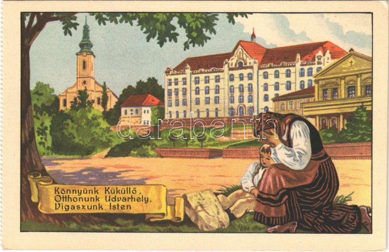 Description: Székelyudvarhely, Odorheiu Secuiesc; Római katolikus főgimnázium és templom. Székely Egyetemi és Főiskolai Hallgatók egyesülete kiadása / church, grammar school, irredenta s: Gebhardt (képeslapfüzetből / from postcard booklet)
