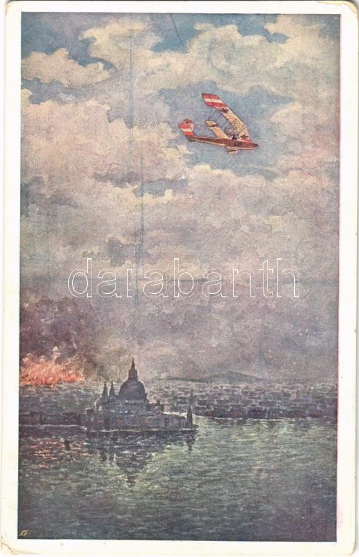 Description: 1917 Zerstörung der Arsenale von Venedig durch unsere tapferen Marineflieger mit Hiero-Flugmotoren. K.u.K. Kriegsmarine Seeflugzeug / WWI Austro-Hungarian Navy seaplane at the Bombing of Venice, naval aircraft. Österr. Industriewerke Warchalowski, Eissler & Co. A.-G. (EK)