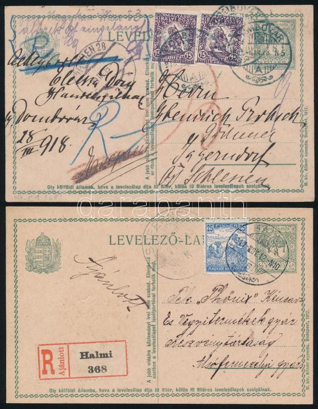 1917-1918 2 db díjkiegészített díjjegyes levelezőlap, mindkettő ajánlott
