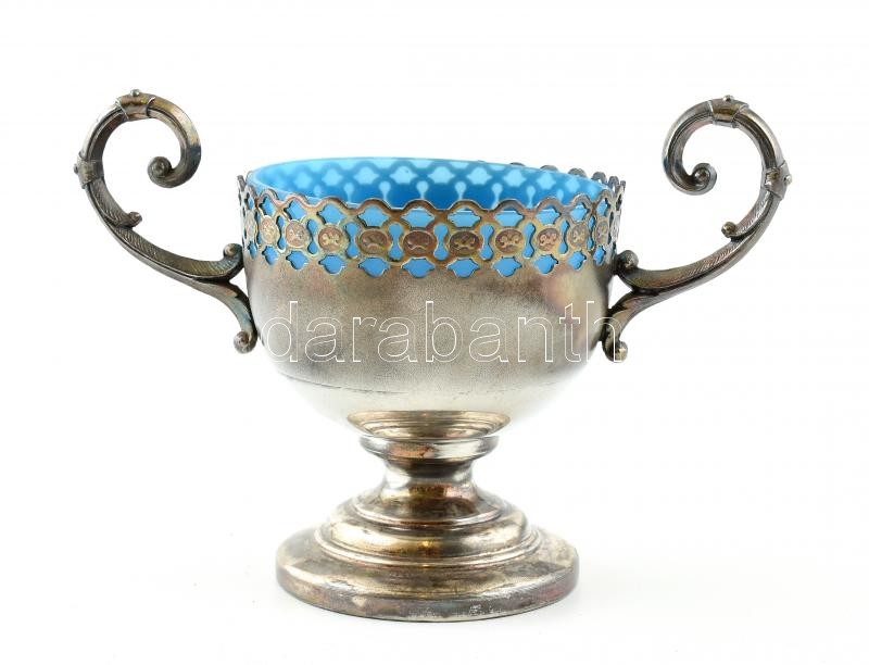 Alpakka füles kínáló, hibátlan kék üveg betéttel. K&Co. h: 20 cm, m: 14 cm