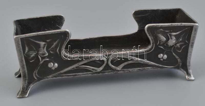 Szecessziós ón teás pohár üveg betéttel + fogpiszkálótartó m: 9 cm, h: 10 cm / Art nouveau tin set