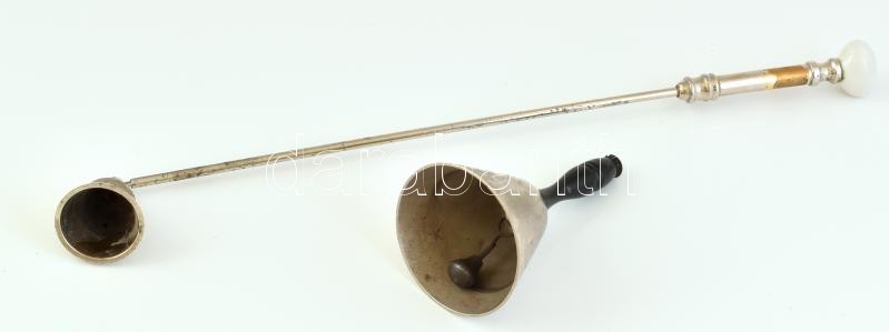 2 db-os bolhatétel, porcelán betétes fém gyertyakoppintó h:40cm és csengő m: 12cm, fém, fa fogóval, kopott.